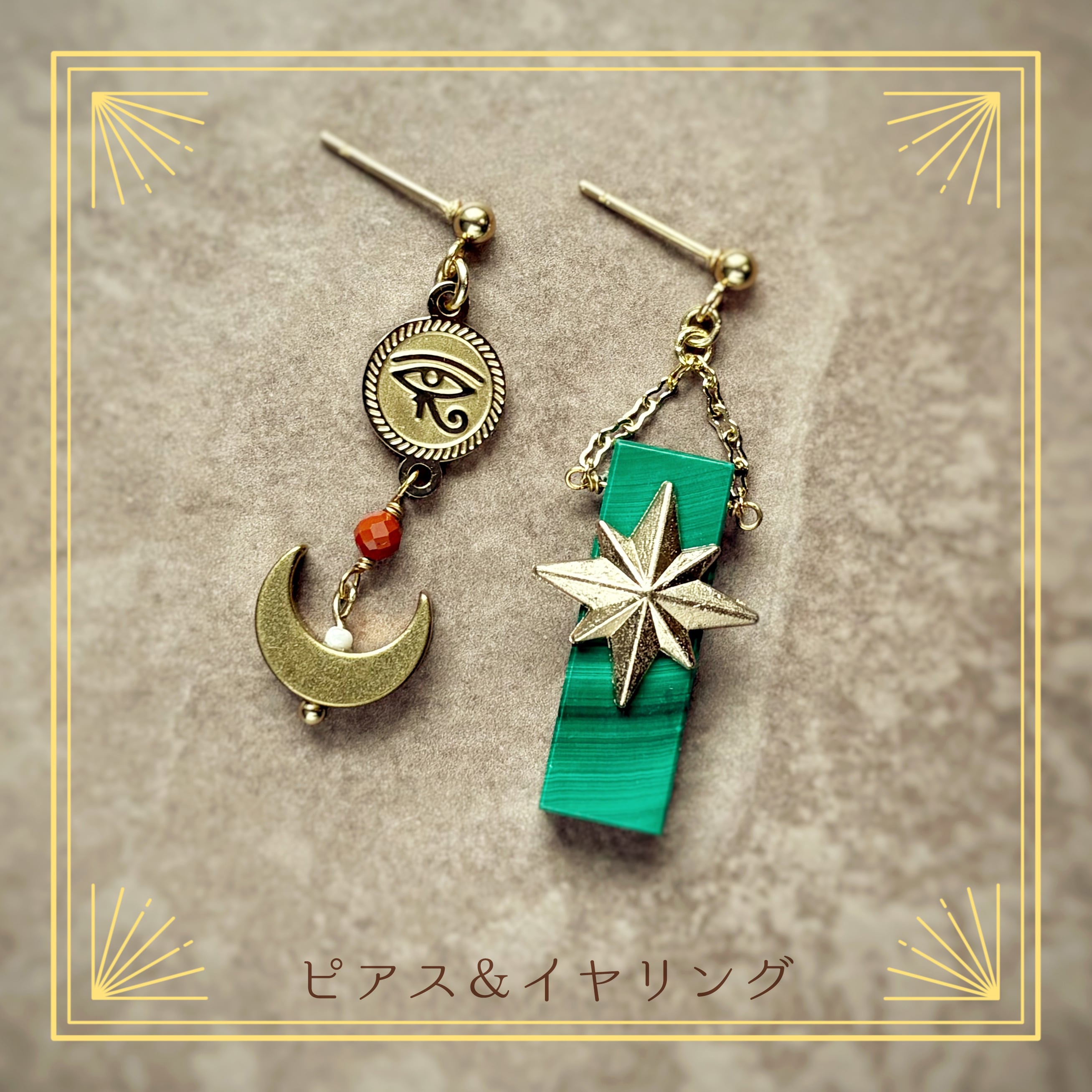 マラカイト、レッドジャスパー、アクリルビーズ、ステンレス(ウジャトの目のパーツ)、sus316サージカルステンレス(ピアス&イヤリング金具、チェーン、丸ピン、丸カン)、真鍮(月モチーフ)