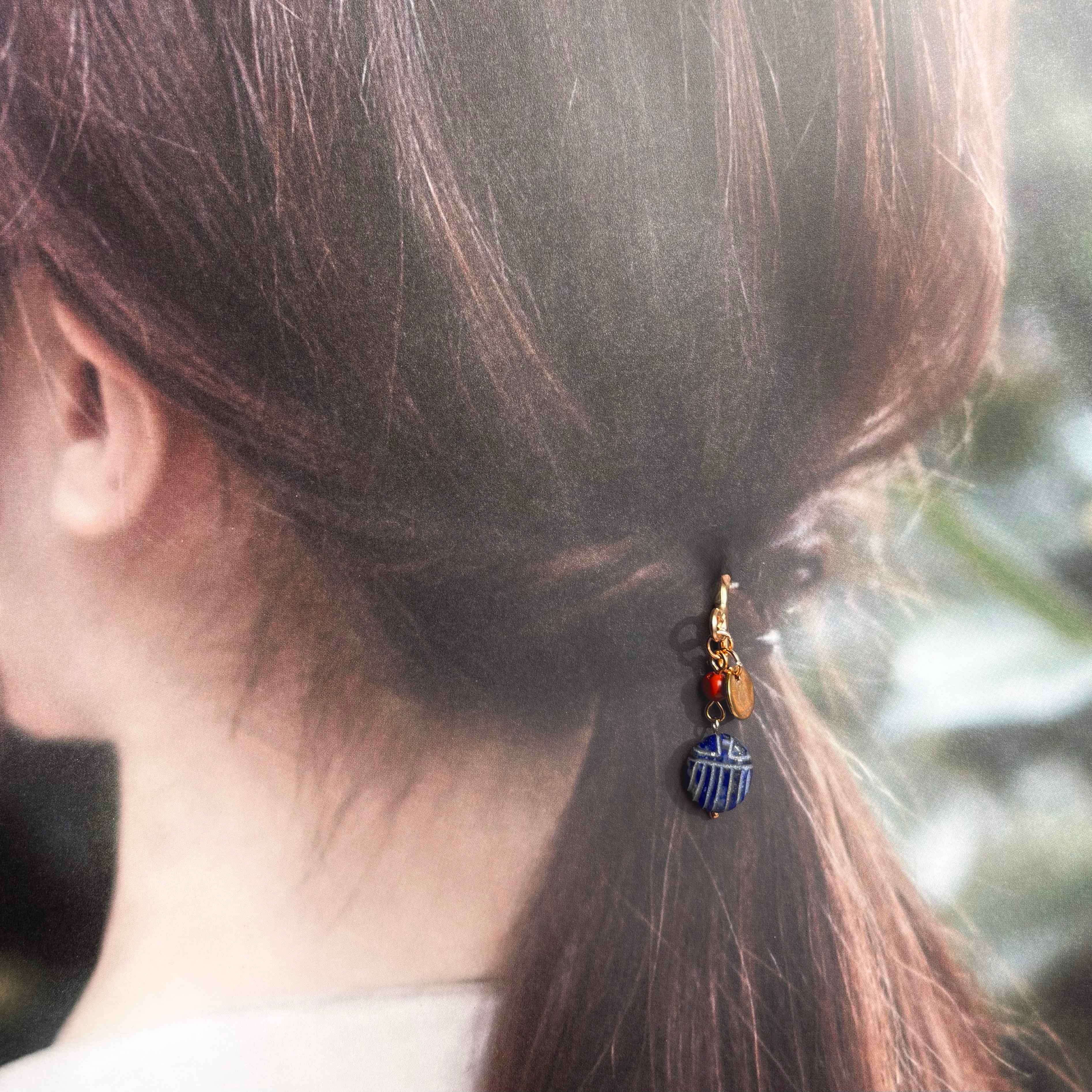 ラピスラズリ製のスカラベを、レッドジャスパーと合わせてポニーフックに仕立てました。