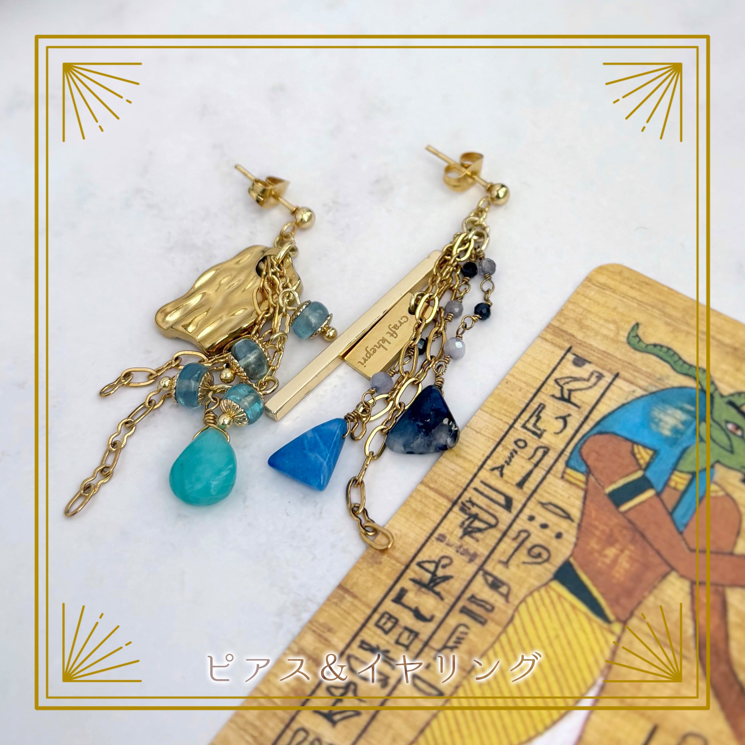 アクアマリン、アマゾナイト、アフガナイト、ブルーサファイヤ、アイオライト、コーティングムーンストーン、ステンレス(ブランドタグ)、sus304サージカルステンレス(波打つゴールドのパーツ、チェーン)・sus316サージカルステンレス(丸カン、ワイヤー、ピアスイヤリング金具)