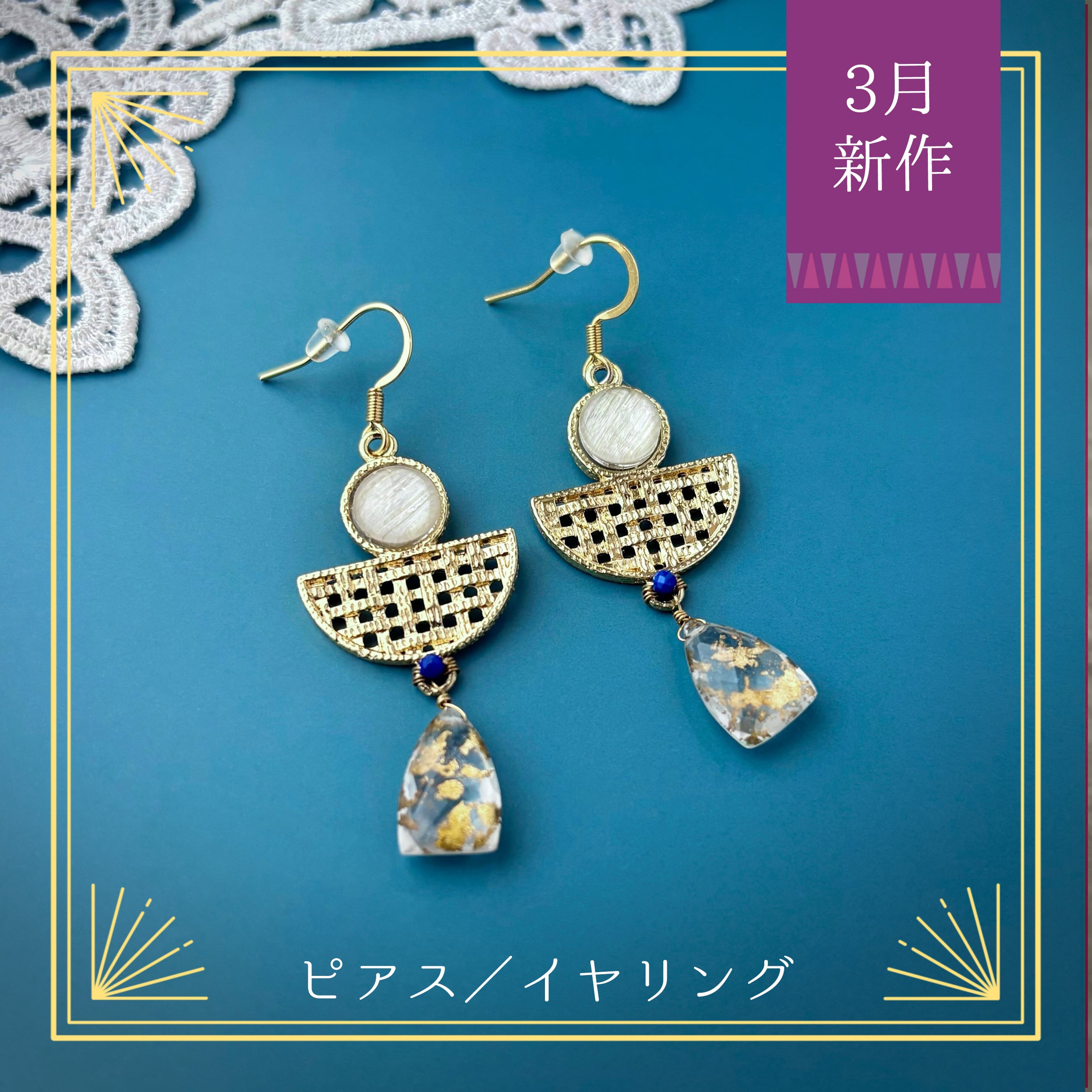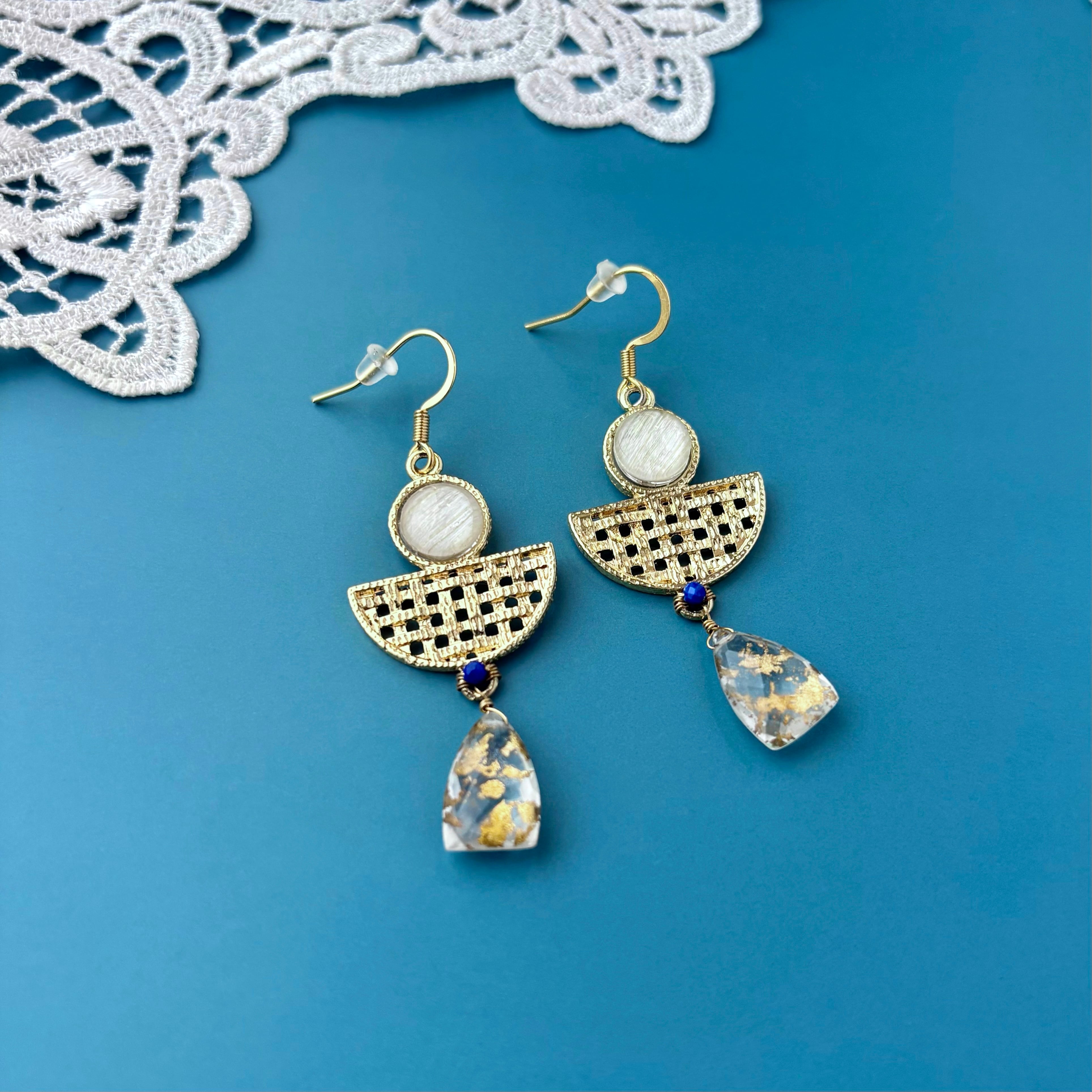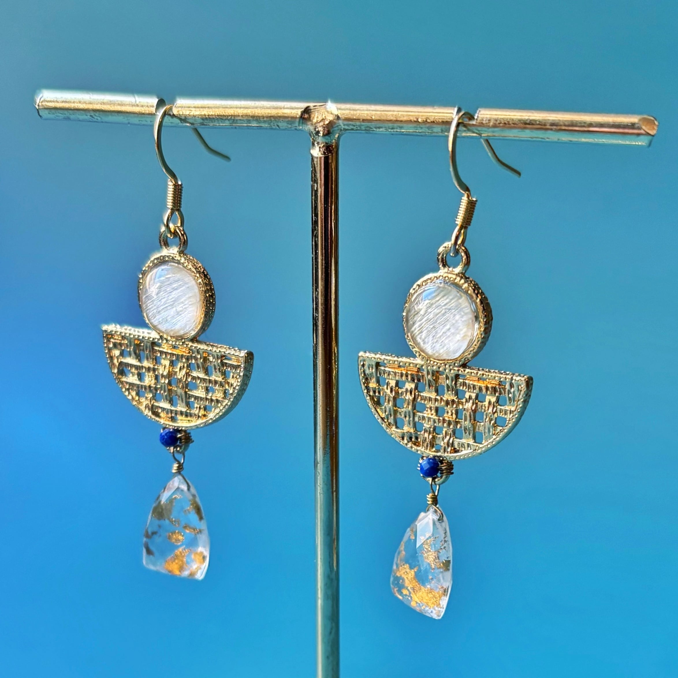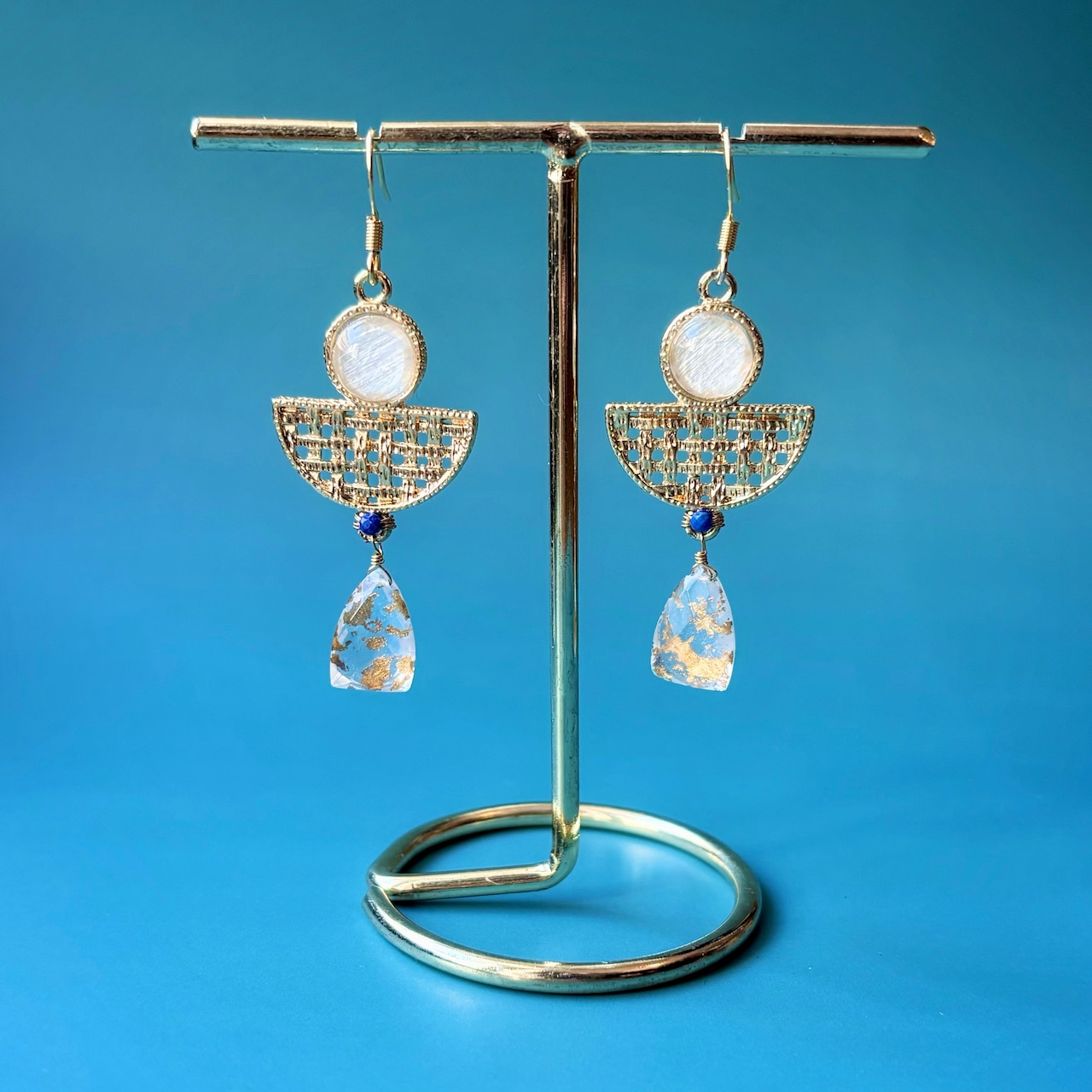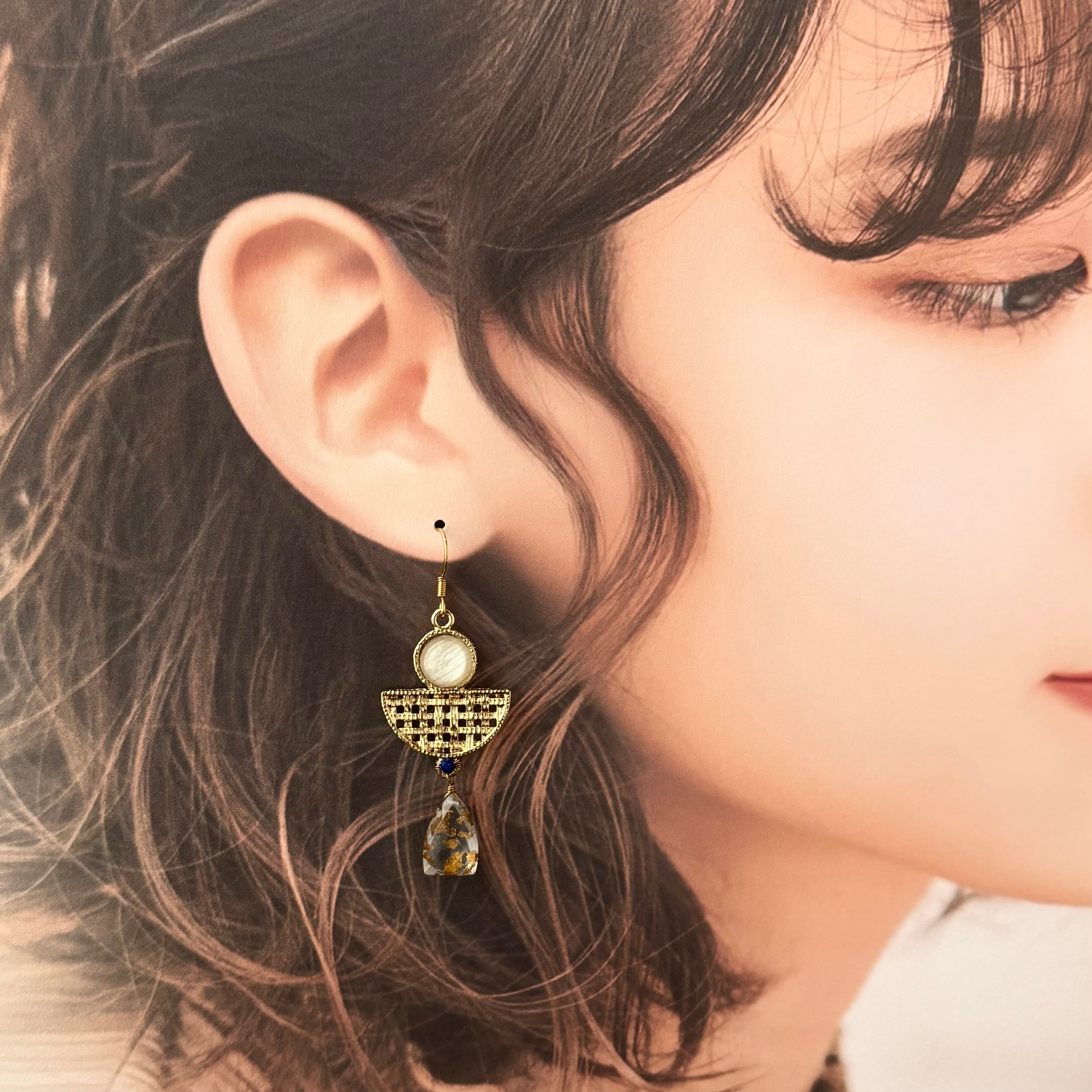 オリエンタルな雰囲気のパーツに合わせたのは、美しい青のラピスラズリと、ゴールドホイルクオーツ(金箔入り水晶)ダブレットです。ダブレットとは、天然石同士を貼り合わせる加工のことで、こちらは水晶と水晶の間に金箔を貼り合わせてあります。