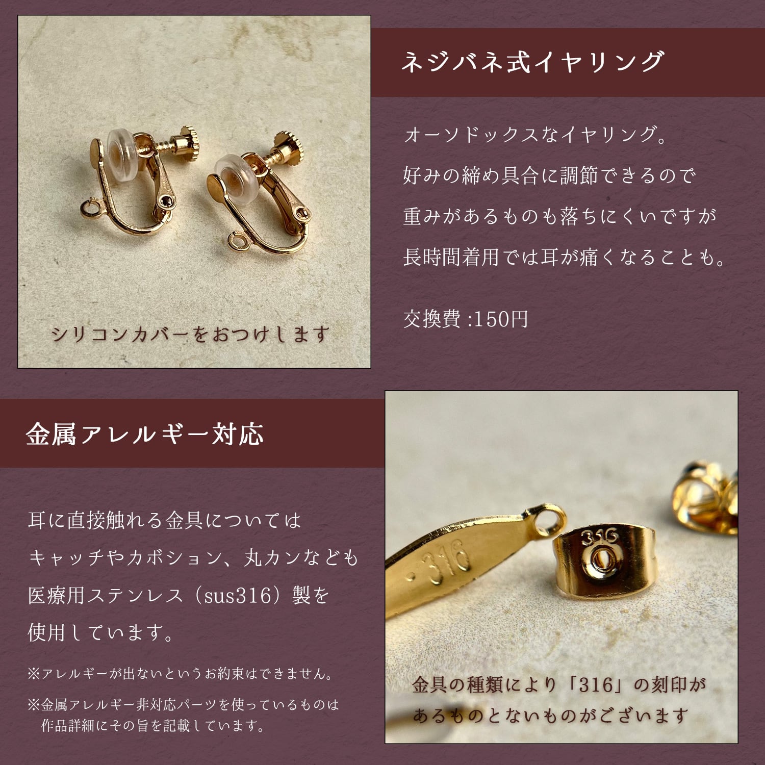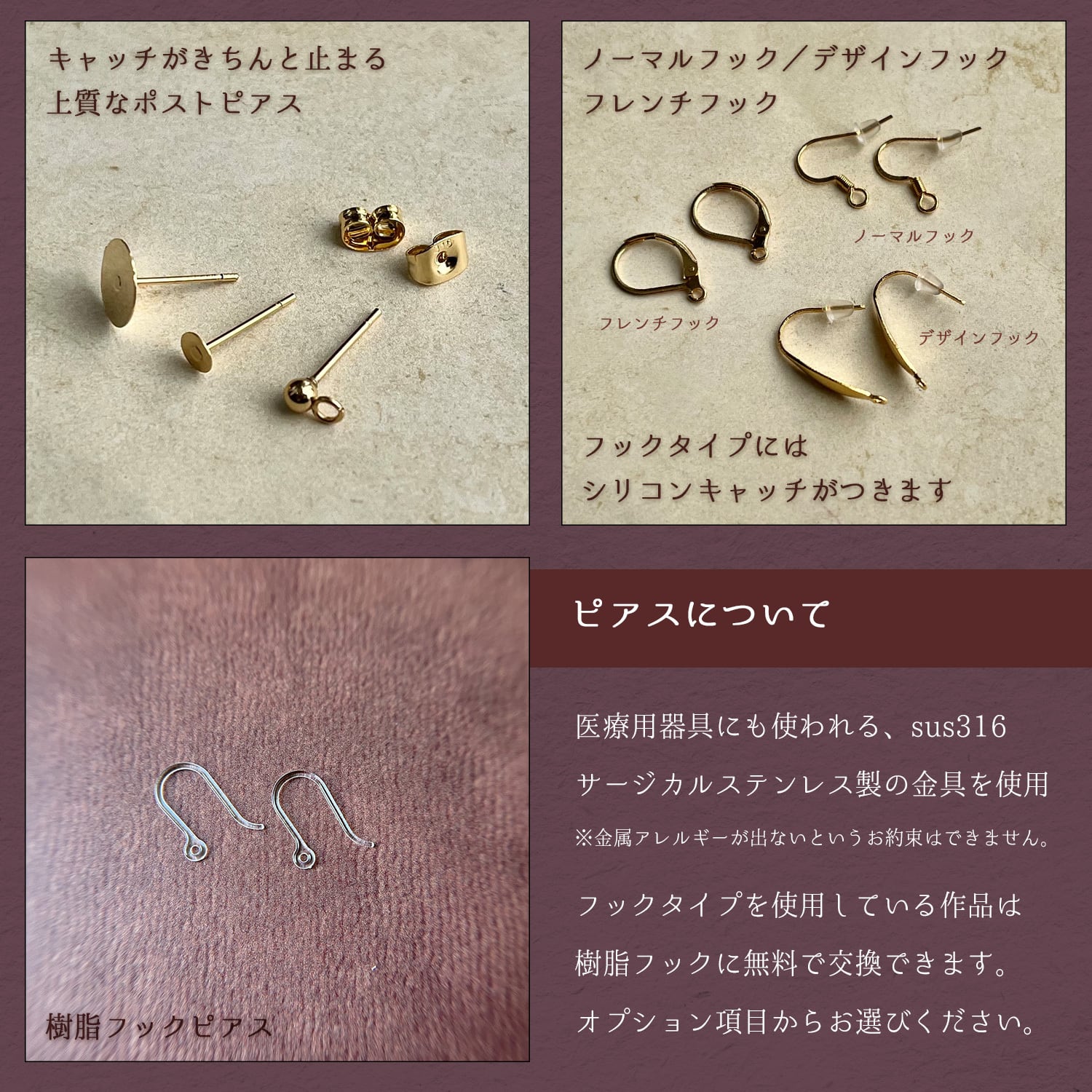 ※ピアス・イヤリング金具と、天然石を留めているワイヤーのみサージカルステンレスです。