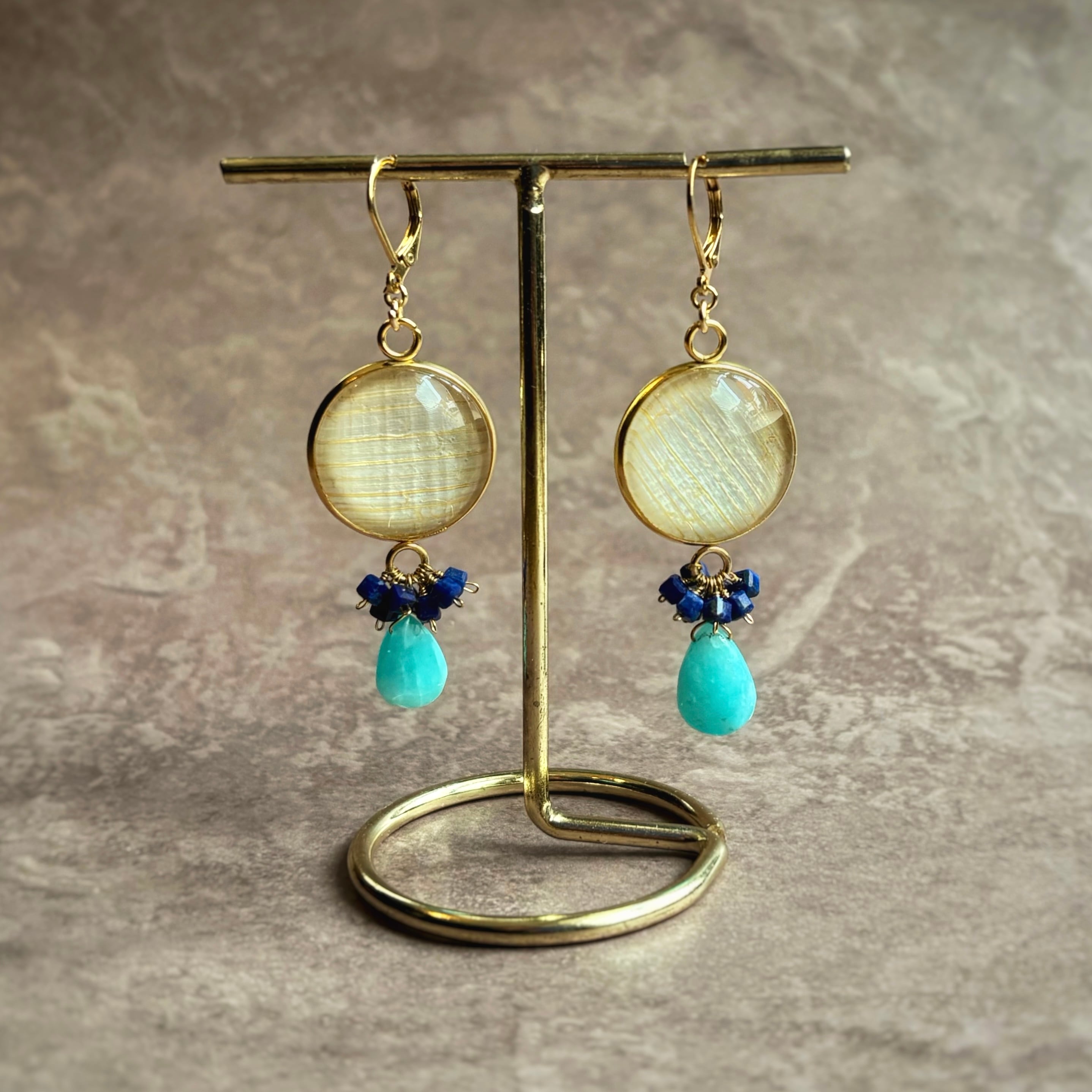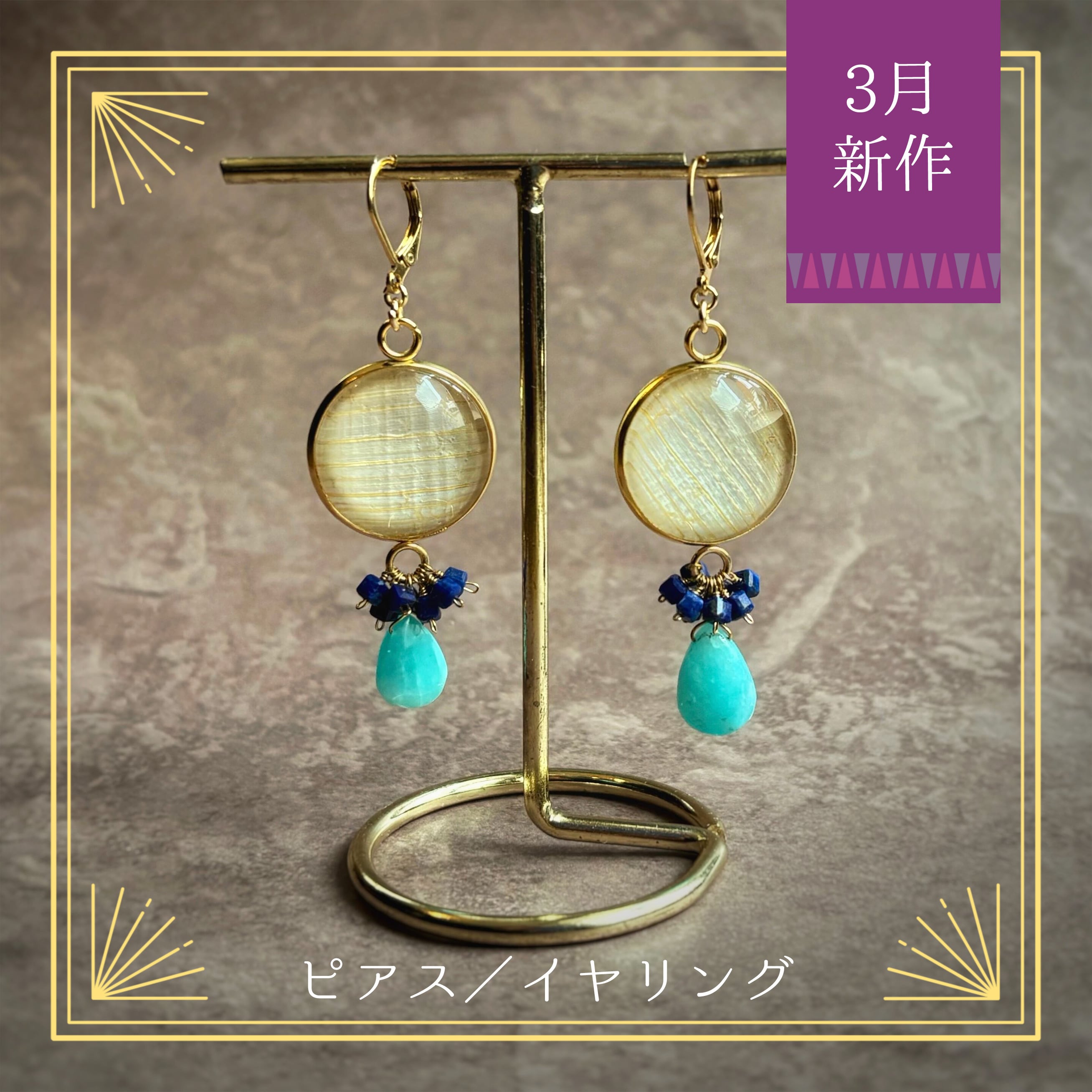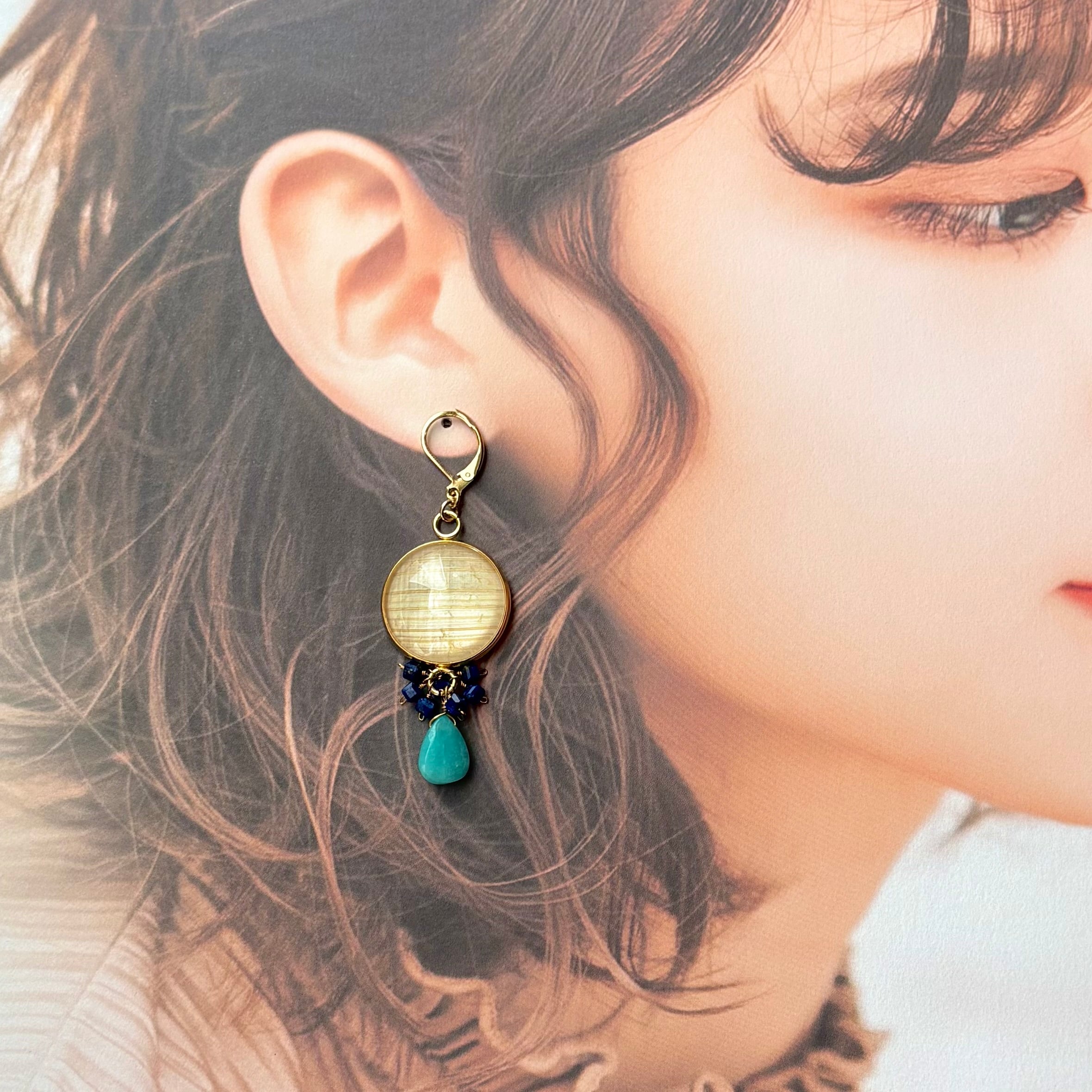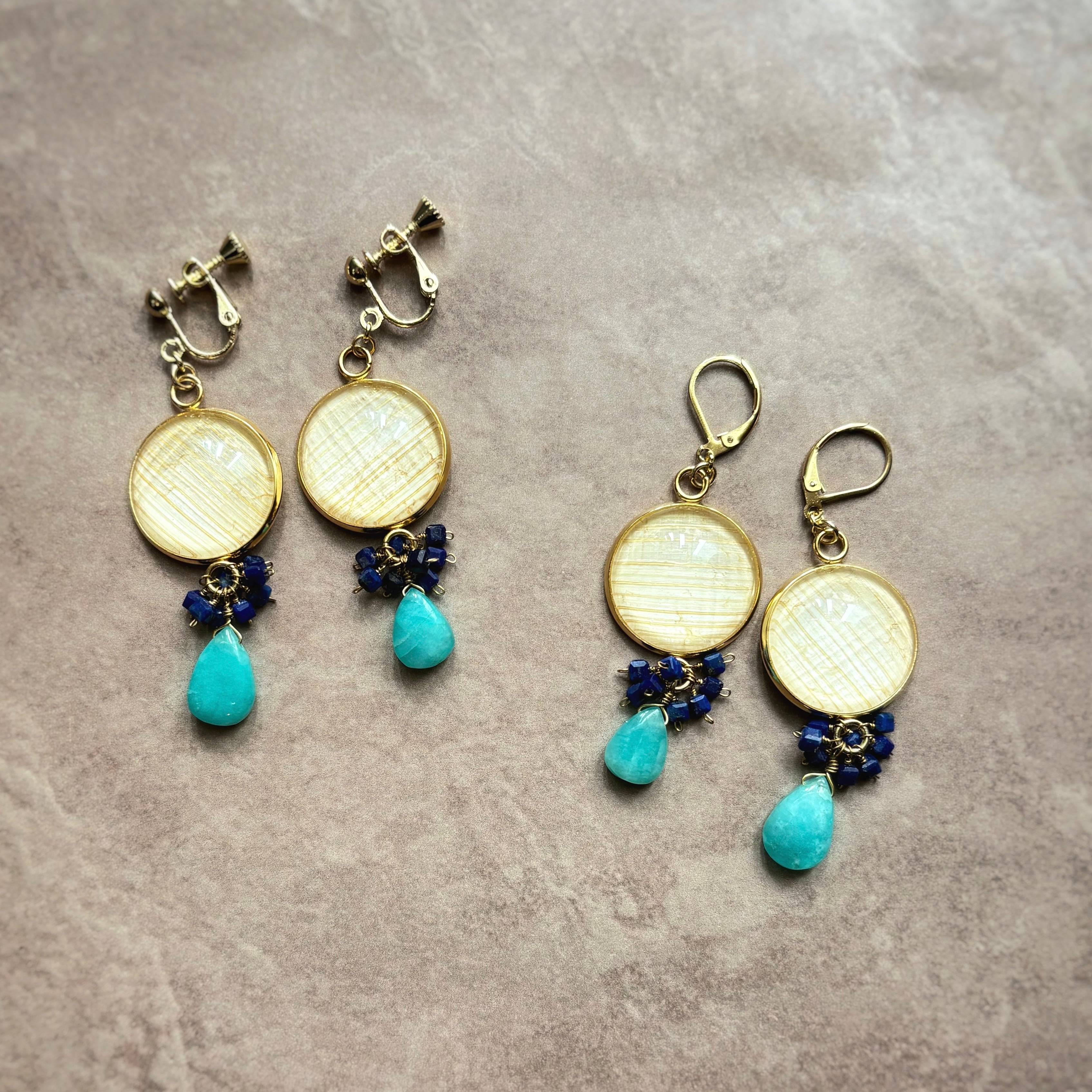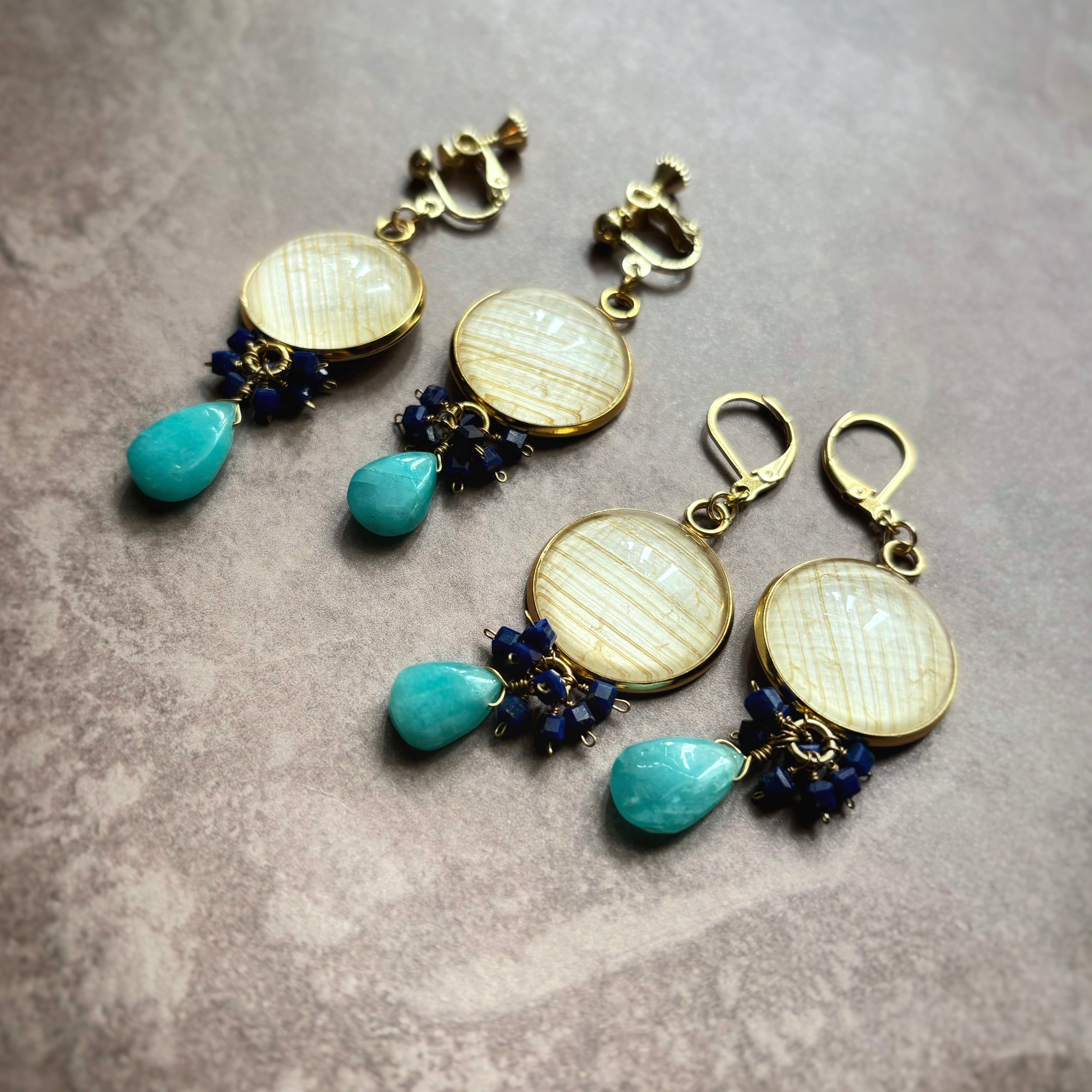 まるで昼と夜それぞれの空のような、アマゾナイトとラピスラズリの美しい青色が、エキゾチックなイメージを一層引き立てます。