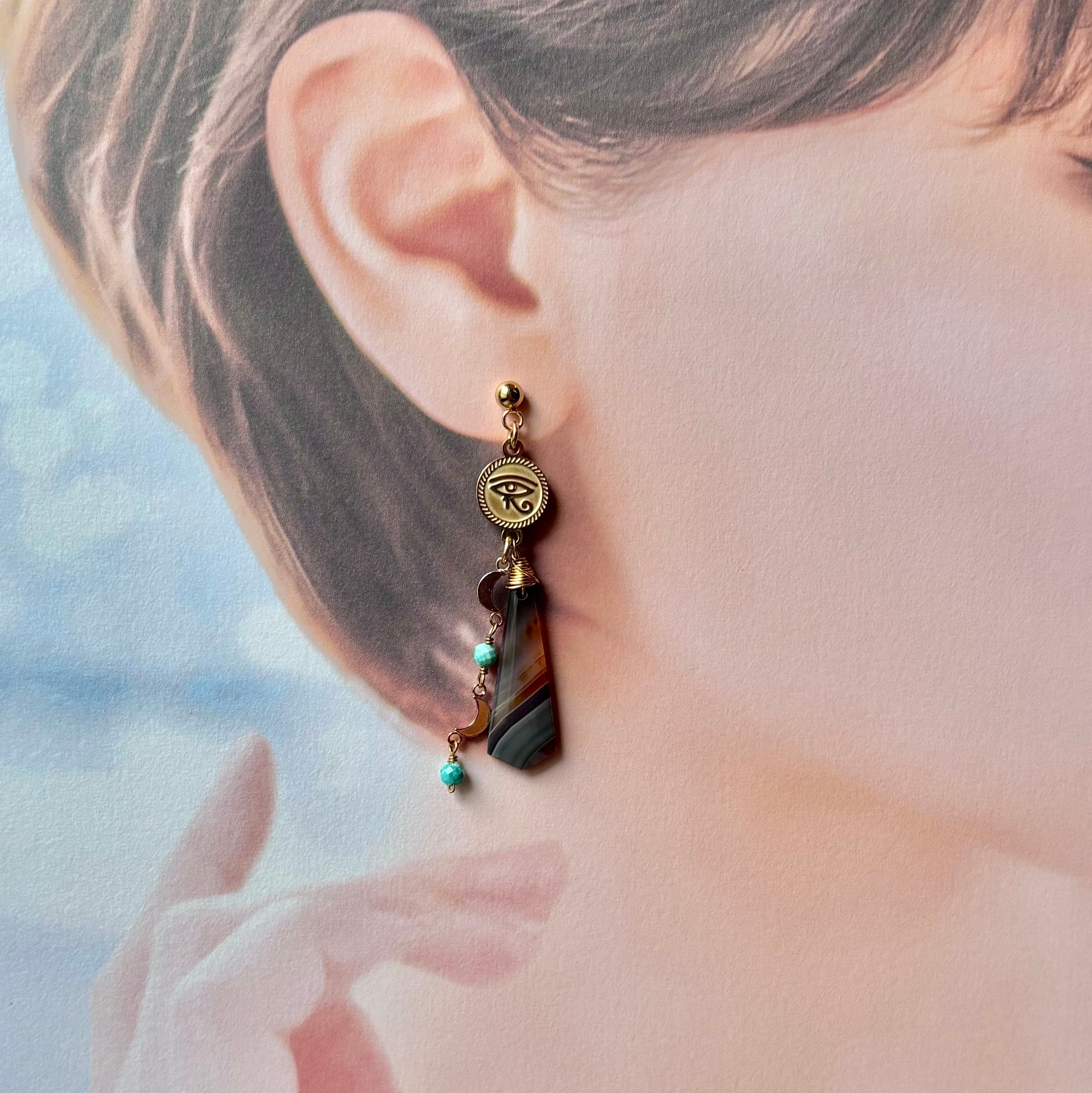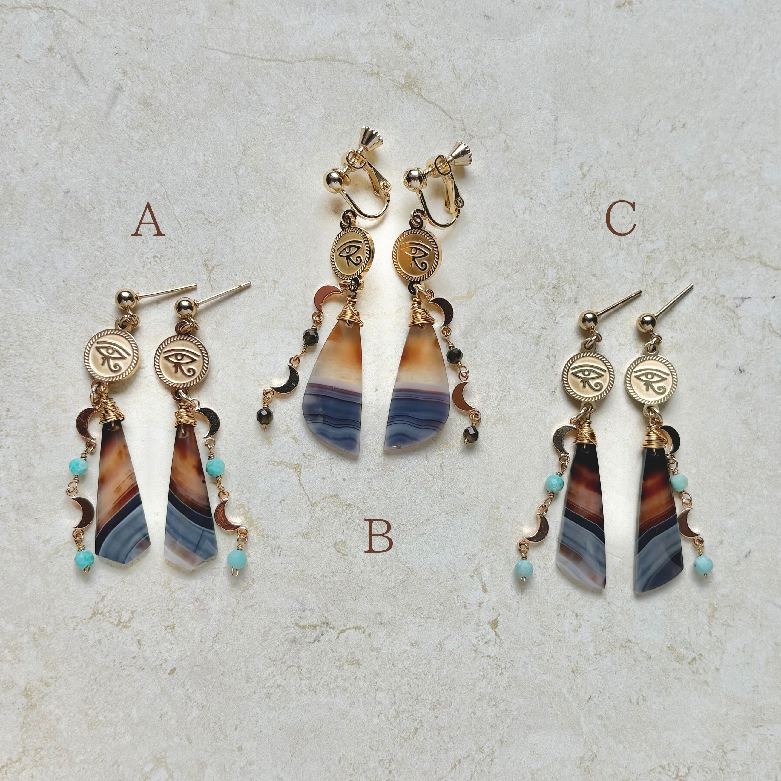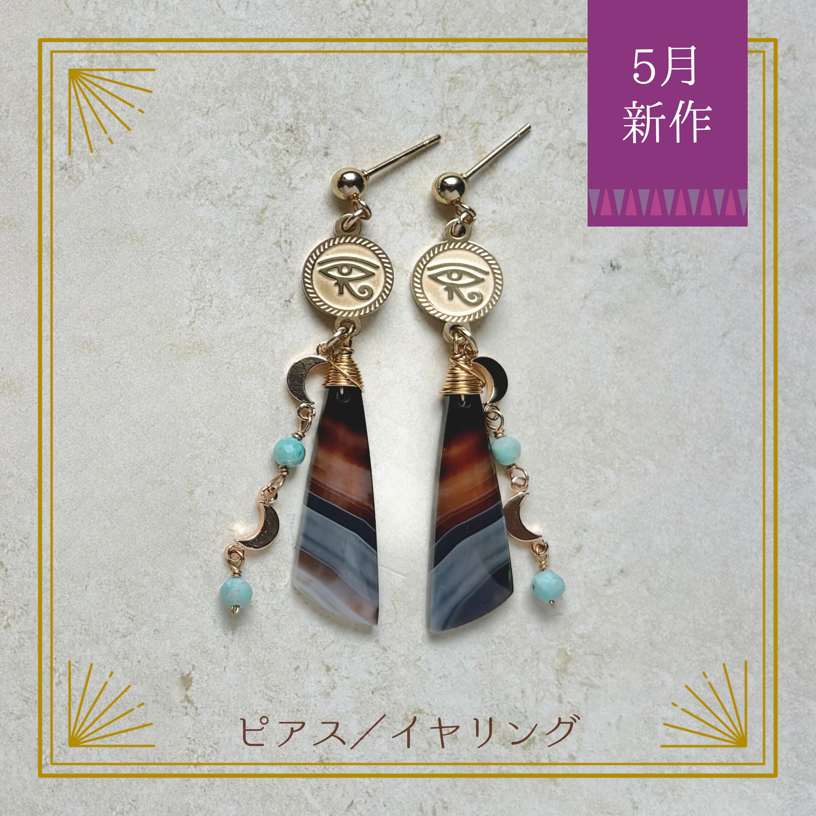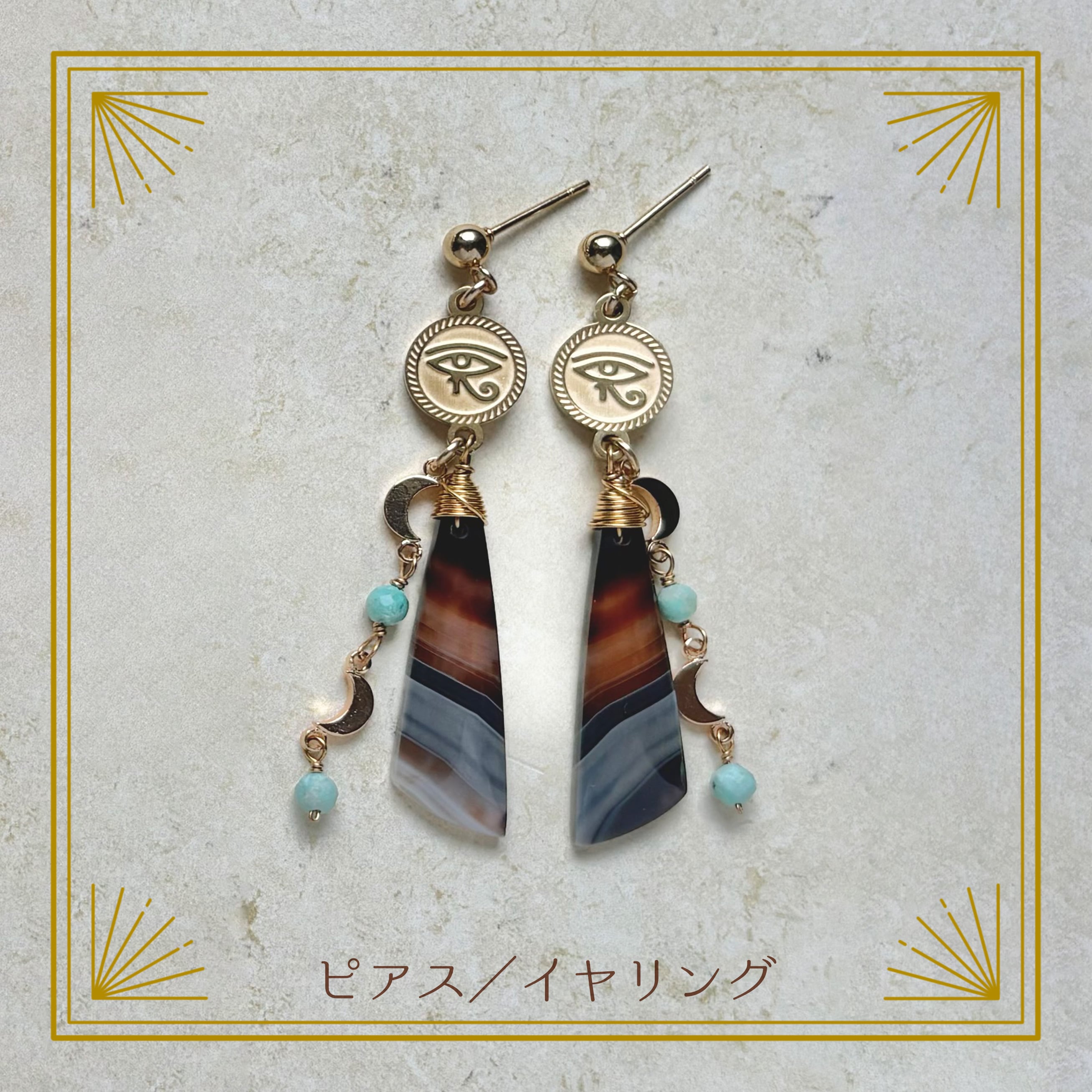 マルチカラーサードニクスをメインに、ウジャト(ホルスの眼)モチーフを大胆に使ったアクセサリーです。