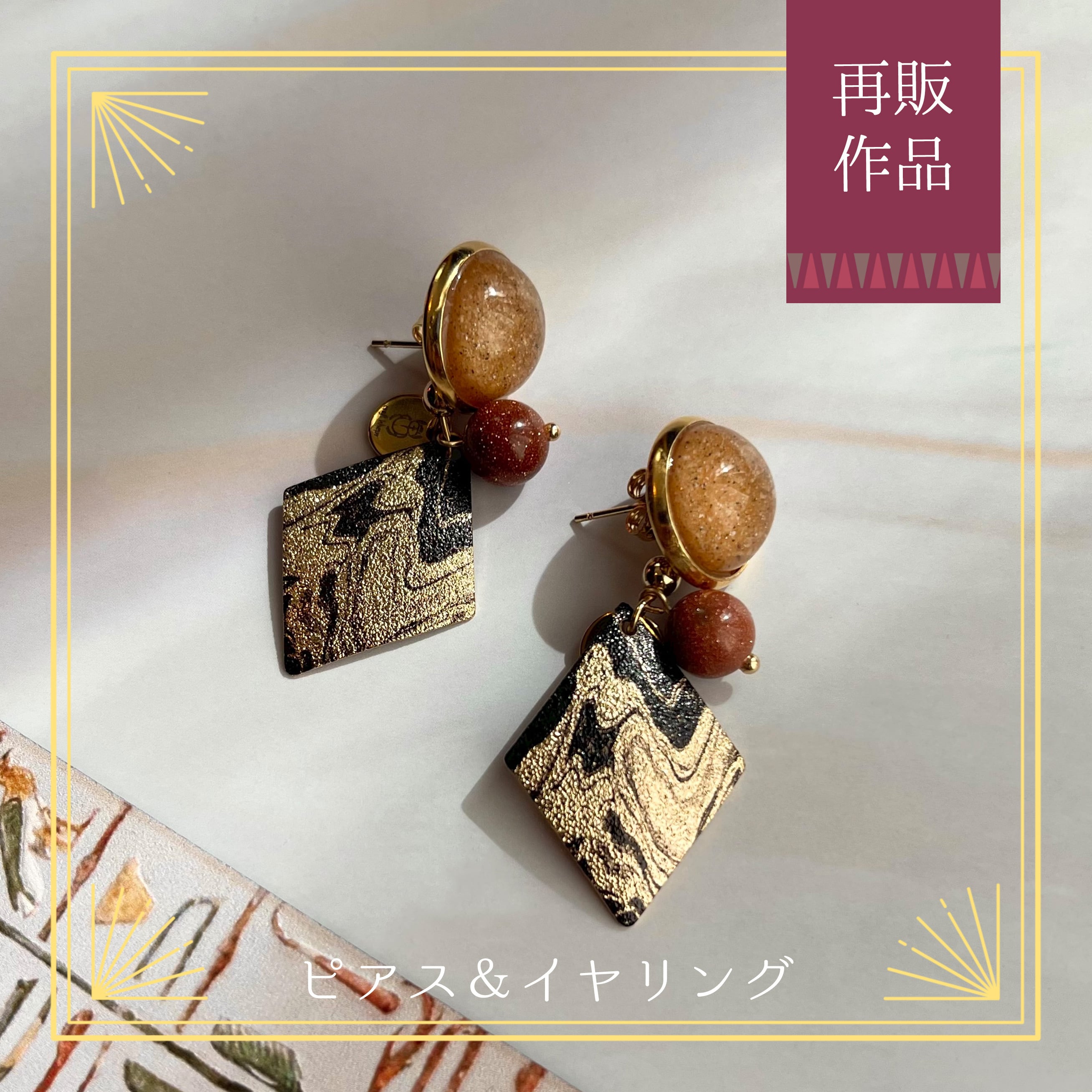 ◆素材:レジン、砂、ゴールドサンドストーン、スチール等。ピアスポスト、イヤリング金具、カボションのフレーム、チャームに使用している丸カンはサージカルステンレス製です。
