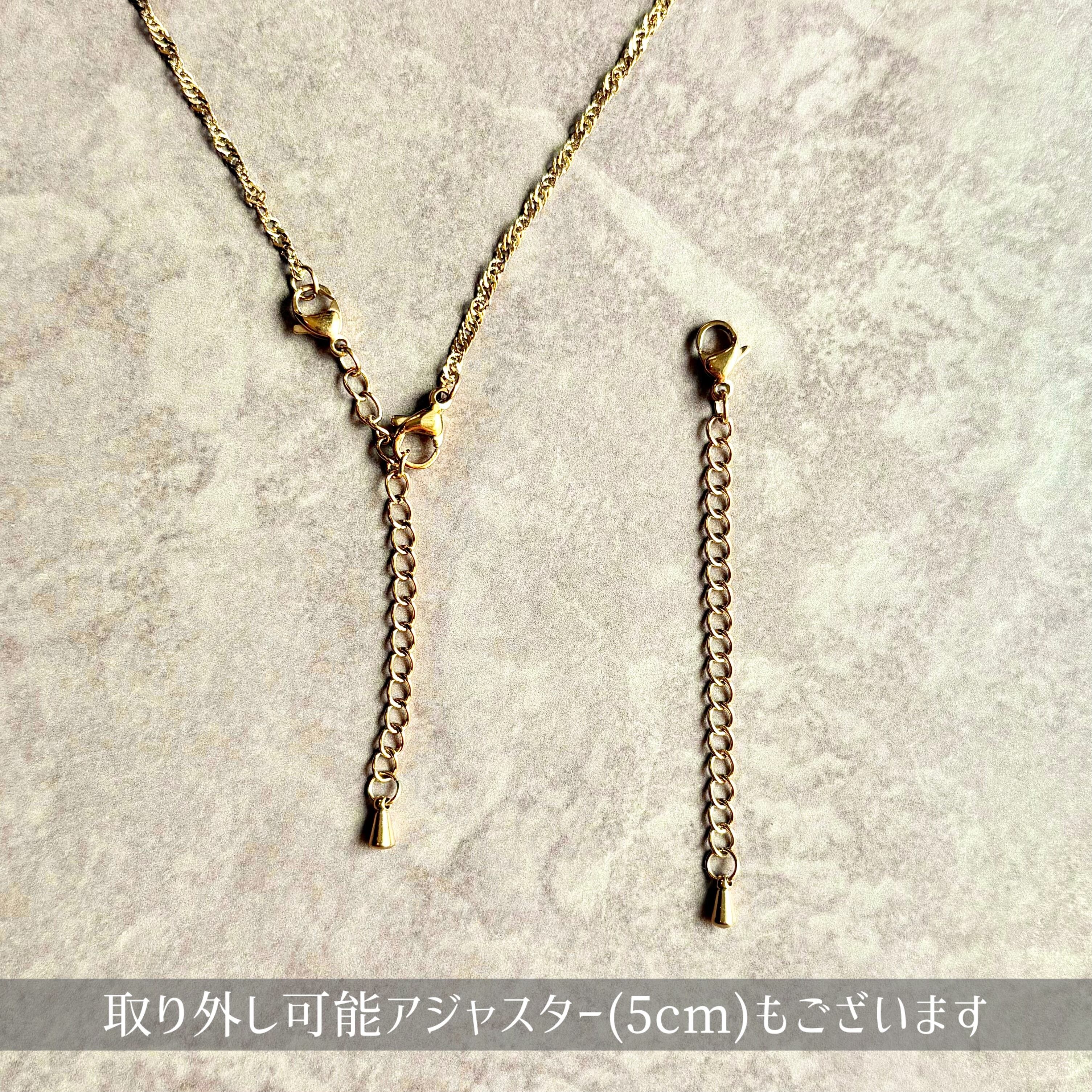 ステンレス製の通常チェーンと、金属アレルギーの方にもやさしいsus316L製チェーンをご用意しています。通常チェーンのみアジャスターがついており、長さの調節ができます。